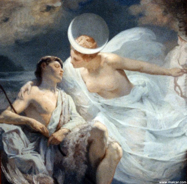 Ο ήλιος έδυσε κι εκείνος εξακολουθούσε να καταδιώκει το θήραμά του μέχρι που η λαμπερή σελήνη ανέβηκε στον ουρανό. Και καθώς αρμένιζε γαλήνια στο στερέωμα έστρεψε το βλέμμα της στη Γη. Κοίταξε κάτω και τον είδε. Και εκείνος αυτήν. Και τότε συνέβη κάτι παράξενο. Δέθηκαν με κάτι σαν μάγια. Έναν έρωτα που καθήλωσε τον Ενδυμίωνα. Όμως για να ενωθεί με την ουράνια αγαπημένη του έπρεπε να πέσει σε έναν παράξενο ύπνο, λέει ο μύθος, κι από εκείνη τη βραδιά εξακολουθούσε να κοιμάται ενώ μέσα στον ύπνο του ερωτοτροπούσε με τη θεά Σελήνη κάνοντας μαζί της 50 κόρες.